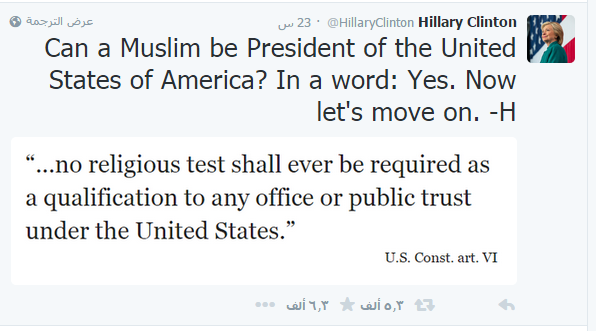 وقالت كلينتون في تغريدة لها على موقع التواصل الاجتماعي “تويتر”: “هل يمكن لمسلم أن يصبح رئيسًا للولايات المتحدة الأميركية؟ بكلمة واحدة: نعم.