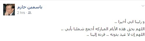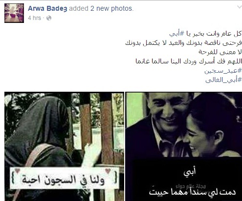 وكتبت أروى منشورا عبر صفحته على موقع “فيس بوك” قالت فيه: “كل عام وأنت بخير يا أبي، فرحتي منقوصة دونك والعيد لا يكتمل دونك، لا معنى للفرحة، عيد سجين”.