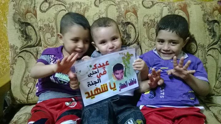 وهذه صورة التقطت لهم وهم يشيرون بعلامة رابعة ويبعثون برسالة إلى أبيهم “عيدكم في الجنة أحلى”.