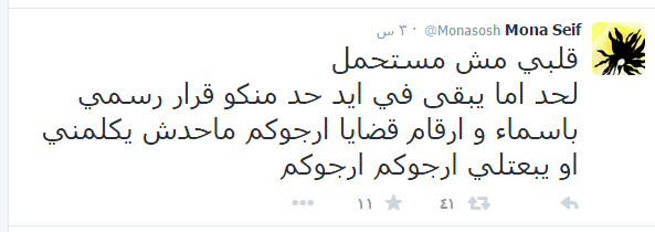وكتبت منى، خلال تدوينة عبر موقع التواصل الاجتماعي “تويتر”: “قلبي مش مستحمل لحد اما يبقى في ايد حد منكو قرار رسمي بأسماء وأرقام قضايا، أرجوكم ماحدش يكلمني أو يبعتلي أرجوكم أرجوكم”.