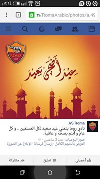 هنأ نادي روما الإيطالي المسلمين بحلول عيد الأضحى المبارك، وذلك عبر صفحته الرسمية على موقع التواصل الاجتماعي “فيس بوك”، حيث تمنى عيدا سعيدا للمسلمين في أنحاء العالم.