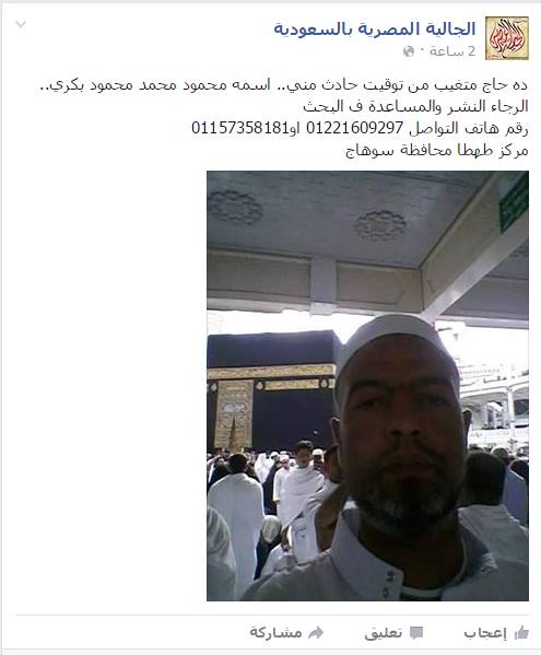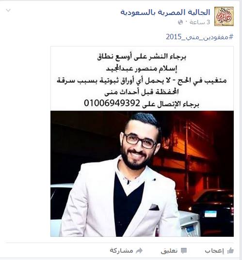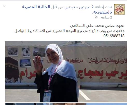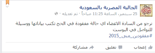 أطلقت الصفحة الرسمية لـ"الجالية المصرية في السعودية"، على موقع "فيس بوك"، حملة للبحث عن الحجاج المصريين المفقودين منذ حادث التدافع في منى، كما دشنت الصفحة هاشتاجًا للبحث عن المفقودين تحت عنوان "#‏مفقودين_منى_2015".