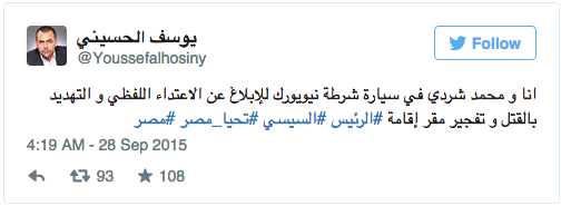 وغرّد الحسيني على “تويتر”: “أنا ومحمد شردي في سيارة شرطة نيويورك للإبلاغ عن الاعتداء اللفظي والتهديد بالقتل وتفجير مقر إقامة الرئيس السيسي”، ما أثار سخرية المتابعين.