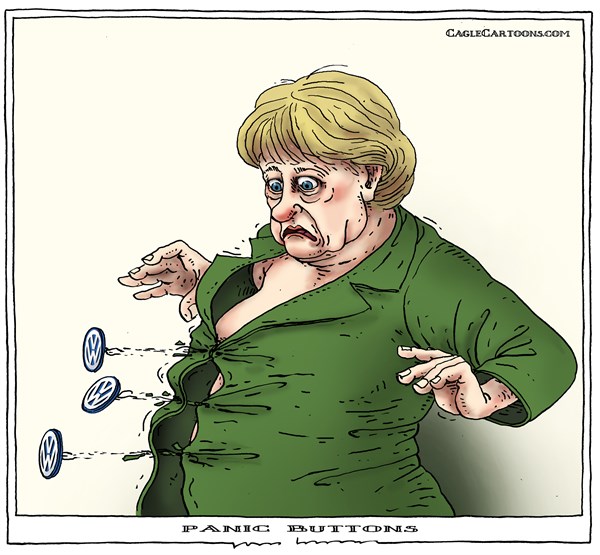ونشر موقع كاجل كارتون رسما للمستشارة الألمانية أنجيلا ميركل أوضح خلاله تأثير فضيحة الشركة العالمية “فولكس واجن” عليها: