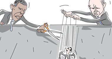 كما أشار الرسام الإسرائيلي للرئيس الأمريكي باراك أوباما، وهو يمسك مقصا يحاول به قطع الحبال الواصلة بين بوتين والأسد، في إشارة إلى وجود حرب باردة بين أوباما وبوتين في سوريا.