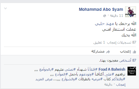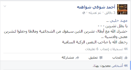 دعا محمد أبو سامي له قائلًا: “الله يرحمك يا مهند حلبي عملت استنفار أمني”، بينما قال أحمد شوقي: “مهند حلبي، يا بطل تشرين أكتوبر حشرك الله مع أبطال أكتوبر الذين سبقوك من الشجاعية وجعلوا لتشرين معنى وقدسية.. رحمك الله يا صاحب النفس الزكية السامية”.