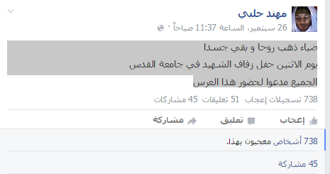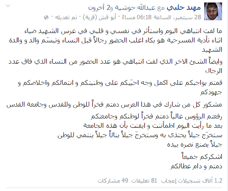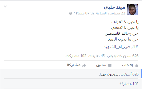 وأخيرًا رثى عينه بكلمات “يا عين لا تحزني يا عين لا تدمعي حن رجالك فلسطين حن ما نخون العهد #افرحي_ام_الشهيد”.