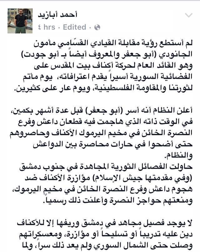 وأضاف أبازيد -في منشور له على صفحته الشخصية بموقع “فيس بوك”- أنه أعلن أن النظام أسر (أبو جعفر) قبل عدة أشهر بكمين، في الوقت ذاته الذي هاجمت فيه داعش وفرع النصرة في مخيم اليرموك الأكناف وحاصروهم حتى أضحوا في حارات محاصرة بين الدواعش والنظام.