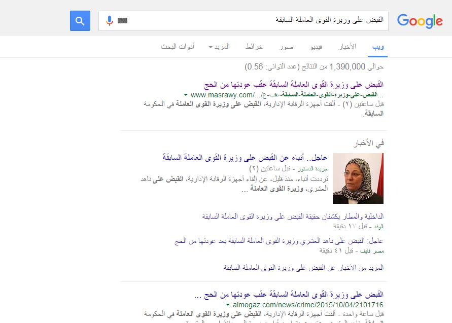 نشر ” موقع مصراوي” خبرًا عاجلاً منذ نحو ساعة أفاد خلاله بأن جهاز الرقابة الإدارية قام بالقبض على وزيرة القوى العاملة في الحكومة السابقة، ناهد العشري، عقب عودتها من أداء فريضة الحج بالأراضي المقدسة بالسعودية، مساء أمس السبت.