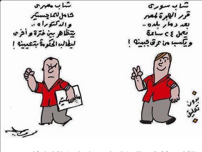 قارن سليم كاريكاتير له بصحيفة “المصري اليوم” بين الشباب السوري الذي أتى لمصر بعد دمار بلدهم دو يعملون 24ساعة وبين الشباب المصري من حملة الماجستير والدكتوراه الذي يقف يوميًا لليتظاهر ويطالب الحكومة بالتعيين.