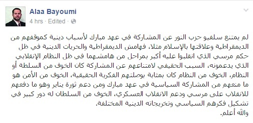 وكتب “بيومي” في منشور له عبر صفحته الرسمية على موقع “فيس بوك”: “لم يمتنع سلفيو حزب النور عن المشاركة في عهد مبارك لأسباب دينية كموقفهم من الديمقراطية وعلاقتها بالإسلام مثلا، فهامش الديمقراطية والحريات الدينية في ظل حكم مرسي الذي انقلبوا عليه أكبر بمراحل من هامشهما في ظل النظام الانقلابي الذي يدعمونه، السبب الحقيفي لامتناعهم عن المشاركة كان الخوف من السلطة أو النظام”.