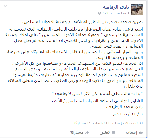 وأضاف “الرفايعة”، “بهذا القرار القضائي وعلى الرغم من أنه قابل للاستئناف، إلا أنه يؤكد على شرعية الجماعة ووجودها القانوني”.