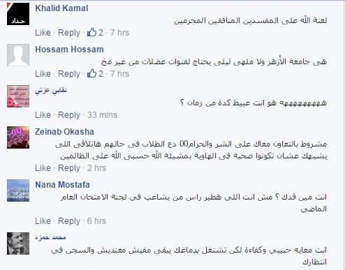 وقال صاحب حساب آخر لشخص يدعى “حسام”: “هي جامعة الأزهر ولا ملهى ليلي يحتاج لفتوّات عضلات من غير مخ”، وقال محمد مختار: “آه .. ده جوز الست”.
