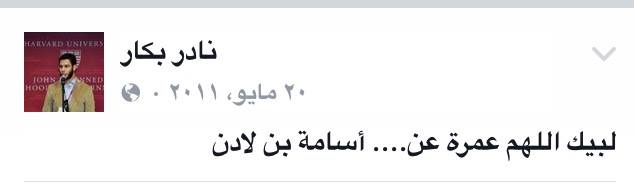 أعاد نشطاء على موقع التواصل الاجتماعي “فيس بوك” اليوم إلى حالة التفاعلية والتعليق والنقاش، منشورًا قديمًا يعود إلى العام 2011، للقيادي بحزب النور السلفي، نادر بكار، نائب رئيس الحزب لشؤون الإعلام، كتب فيها: “لبيك اللهم عمرة عن.. أسامة بن لادن”.