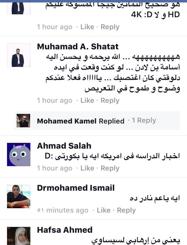 أما محمد عبد الكريم فقال: “بلاغ للأمن الوطني هذا الشخص يتغزل في زعيم تنظيم ما يسمى دولة العراق الإسلامية سابقًا، نرجو اعتقاله ووضعه في جوانتانمو أو أبو غريب أيهما أقرب”، وطالب أحد المعلقين من عبد الفتاح السيسي معرفة حقيقة بكار، قائلاً: “يا حزن الحزن شوف يا ريس اللي عامل فيها وطني دلوقتي”، وطالب أحمد عيد في أحد تعليقاته “بكار” بحذف المنشور، قائلاً “الحق احذفه يا مدلس هتتفضح فضيحة عجب”.