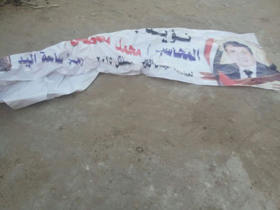 فيما وصلت حرب تمزيق اللافتات الى دائرة الصف بالمحافظة، إذ تم تمزيق الافتات الدعائية لعلاء عابد، مرشح حزب المصريين الاحرار بالدائرة.