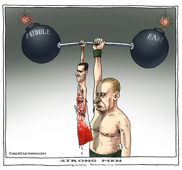 ونشر موقع “كاجل” كارتون كاريكاتير للرجل الأقوى فلاديمير بوتين، وهو يحمل الشرق الأوسط الذي يبدو أنه قد “قرب انفجاره” ومعه بشار الأسد “ملطخا بالدماء”.