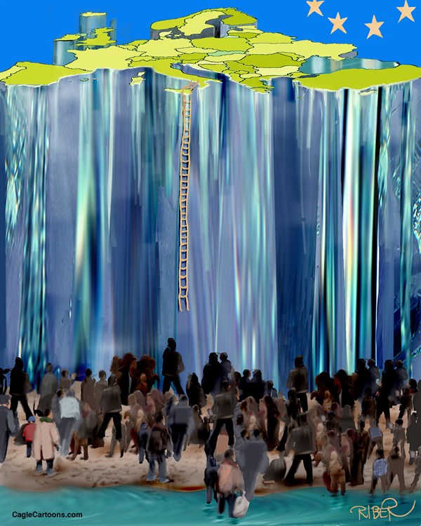 وعبر الرسام ريبر هاكسون عن رفض دول الاتحاد الأوروبي استقبال اللاجئين في بلادهم بهذا الرسم.