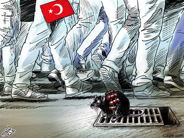 وفي ما يخص انفجاري تركيا اليوم، قدم موقع “كاجل” كاريكاتيرا للرسام الأردني أسامة حجاج تحت عنوان “الهجمات الإرهابية في تركيا”، صور خلاله القائمين بالتفجيرات والعمليات الإرهابية بـ“الفئران”.