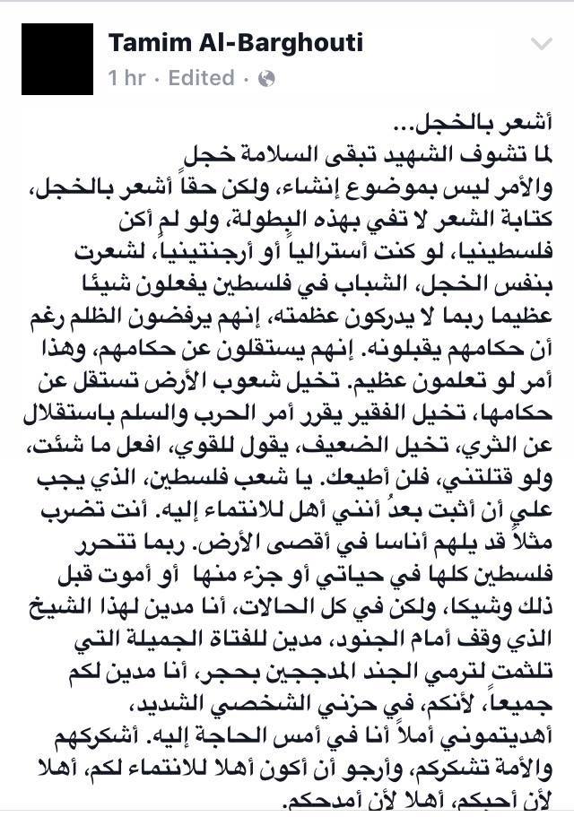وأضاف “البرغوثي” -في منشور له على صفحته بموقع “فيس بوك”- “الأمر ليس بموضوع إنشاء، ولكن حقًا أشعر بالخجل، كتابة الشعر لا تفي بهذه البطولة، ولو لم أكن فلسطينيًا، لو كنت أستراليًا أو أرجنتينيًا، لشعرت بنفس الخجل”.