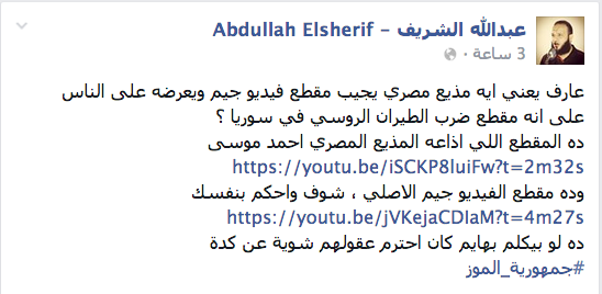 وتساءل الناشط والشاعر “عبدالله الشريف” -خلال منشور له على صفحته على “فيس بوك”-: “عارف يعني إيه مذيع مصري يجيب مقطع فيديو جيم ويعرضه على الناس على إنه مقطع ضرب الطيران الروسي في سوريا؟، ساخرًا: لو بيكلم بهايم كان احترم عقولهم شوية”.