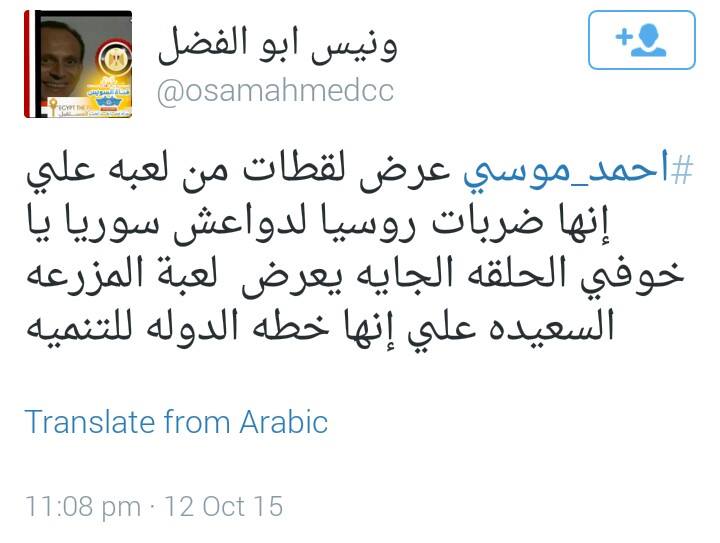 وعرض موسى، في حلقة برنامجه أمس، فيديو للعبة تسمى “apache assault”، ظهرت في عام 2010، على أنه القصف الذي توجهه روسيا لتنظيم “الدولة” قائلا: “وروني الروس عملوا إيه؟ هذا هو الجيش الروسي والسلاح الروسي، هذا هو بوتين، ما تشاهدونه فيديو مرعب، وكأن الروس يصطادون عصافير”، مضيفا: “الروس بيحاربوا الإرهاب بجد”.