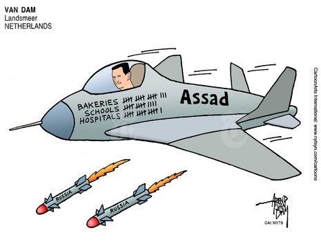 أما نيويورك تايمز فقد نشرت كاريكاتيرا تسخر فيه من بشار الأسد واستخدامه للأسلحة الروسية من أجل قصف المدنيين والمدارس والمستشفيات.