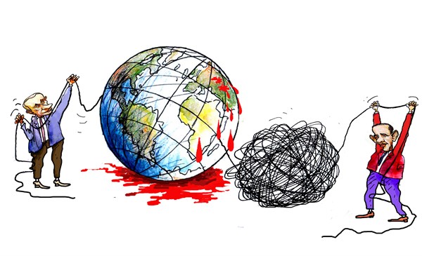 وفي الشأن السوري نشر كاريكاتيرا عن السياسة المعقدة لبشار الأسد وحليفة فلاديمير بوتين ومايعانيه العالم بأكمله لا سوريا فقط جراء هذا التحالف.