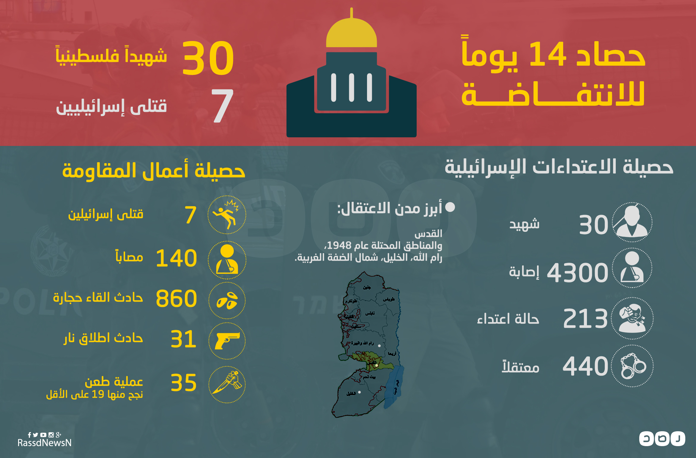 وبينت الإحصاءات أن حصيلة أعمال المقاومة على الأرض بلغت مقتل 7 إسرائيليين، وإصابة 140، بالإضافة إلى 860 حادث القاء حجارة، و31 حادث إطلاق نار في عشرة أيام، و35 عملية طعن نجح منها 19 على الأقل.