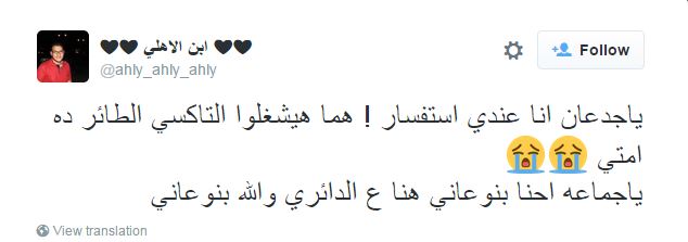 وعلق ابن الأهلي قائلًا: “ياجدعان أنا عندي استفسار! هما هيشغلوا التاكسي الطائر ده إمتي.. احنا بنوعاني هنا ع الدائري والله بنوعاني.