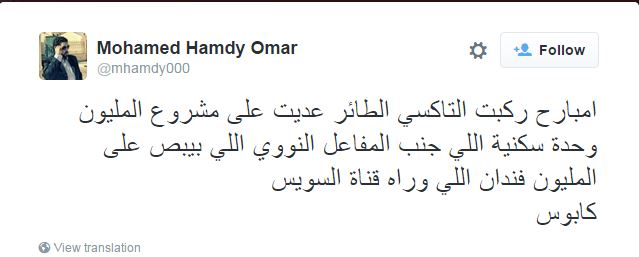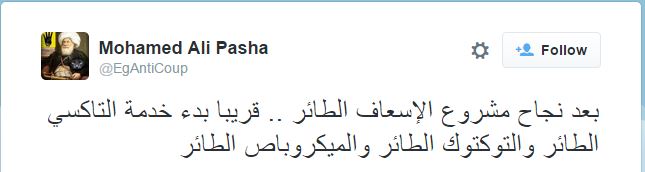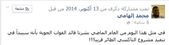 يقول محمد إلهامي: “في مثل هذا اليوم من العام الماضي بشرنا قائد القوات الجوية بأنه سيبدأ في تنفيذ مشروع التاكسي الطائر قريبًا!!!“.