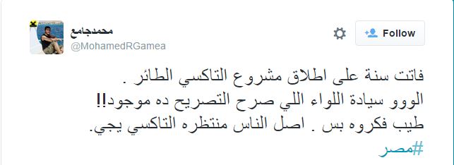 وقال محمد جامع: “فاتت سنة على إطلاق مشروع التاكسي الطائر.. ألووو سيادة اللواء اللي صرح التصريح ده موجود!! طيب فكروه بس. أصل الناس منتظره التاكسي يجي”.