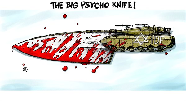 وعلق الموقع نفسه على الانتفاضة الفلسطينة الحادثة في الضفة الغربية، عبر هذا الرسم الذي يصور أن السكينة الحقيقية هي التي تقتل بها آلة الحرب الإسرائيلية الفلسطينيين.