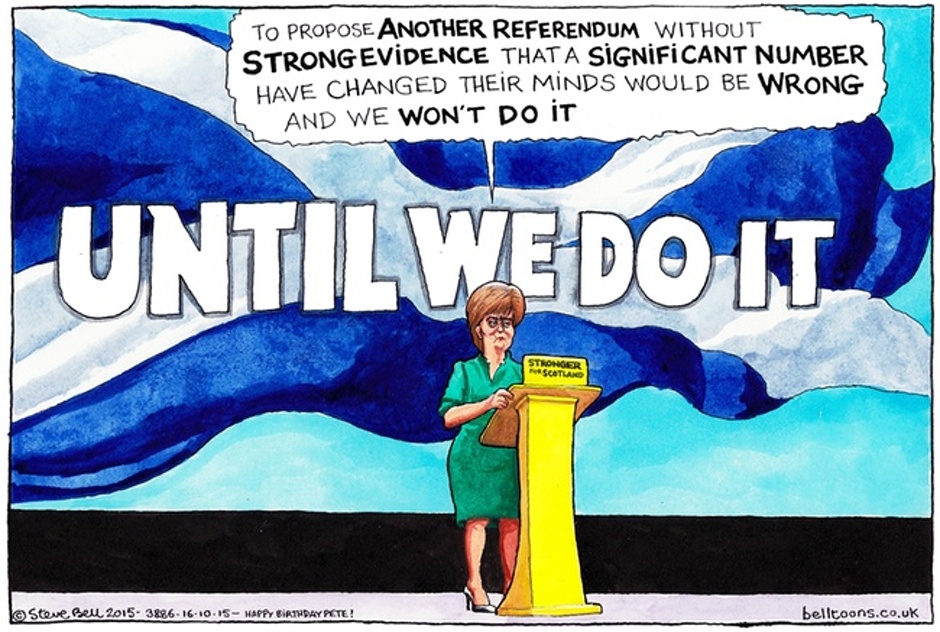 وكان كاريكاتير “الجارديان” البريطانية اليوم، عن استفتاء استقلال أسكتلندا حيث قالت نيكولا ستورجين: “سيتم تجميد الاستفتاء الثاني على استقلال أسكتلندا حتى يظهر دليلا قويا وثابتا على تغير الرأي العام”.