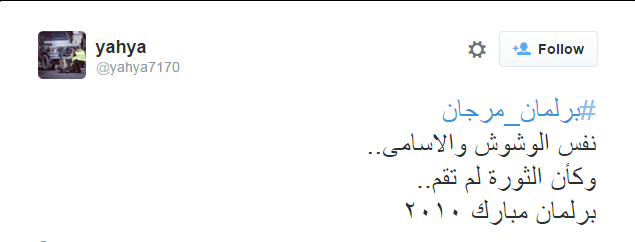 وشبه yahya البرلمان القادم ببرلمان مبارك 2010، قائلًا: “نفس الوشوش والأسامي.. وكأن الثورة لم تقم.. برلمان مبارك ٢٠١٠”.