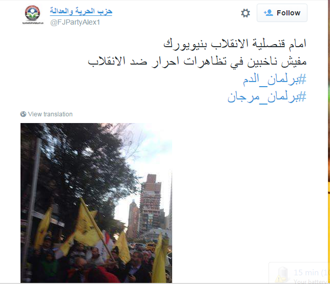 ونشرت صفحة حزب “الحرية والعدالة” صورة بنيويورك، أظهرت وقفة لمناهضي الانقلاب العسكري، وعلقت قائلة: “مفيش ناخبين في تظاهرات أحرار ضد الانقلاب”.