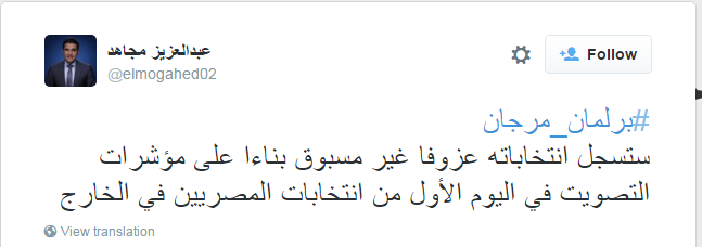 وعلق الإعلامي عبدالعزيز مجاهد قائلًا: “ستسجل انتخاباته عزوفًا غير مسبوق بناءً على مؤشرات التصويت في اليوم الأول من انتخابات المصريين في الخارج”.
