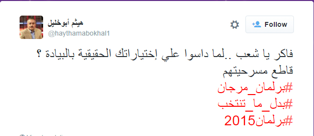 وطالب الناشط الحقوقي، هيثم أبو خليل، الشعب المصري بمقاطعة الانتخابات قائلًا: “فاكر يا شعب.. لما داسوا على اختياراتك الحقيقية بالبيادة؟ قاطع مسرحيتهم”.