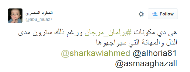 ووضع المغرد المصري صورة تحمل مكونات البرلمان القادم من وجه نظره، قائلًا: “مكونات برلمان مرجان، ورغم ذلك سترون مدى الذل والمهانة التي سيواجهوها”.