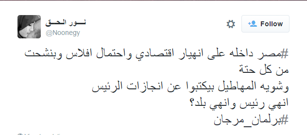 وأعرب المغردون عن استيائهم من المرشحين للمجلس القادم، والذين جمعوا بين أتباع الحزب الوطني ورجال مبارك، وممن عرفوا بالفساد، وأصحاب المصالح والوساطة والمحسوبية، وذلك بحسب قولهم.