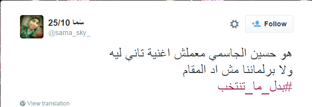 وتساءلت سَما ساخرة: “هو حسين الجاسمي معملش أغنية تاني ليه؟ ولا برلماننا مش اد المقام”.