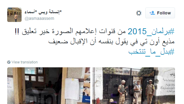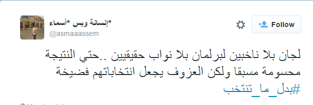 ‏ووصفت asmaa assem انتخابات اليوم بأنها “لجان بلا ناخبين لبرلمان بلا نواب حقيقيين.. حتي النتيجة محسومة مسبقًا، ولكن العزوف يجعل انتخاباتهم فضيحة”، ونشرت صورة عرضت على قناة “أون تي في” تبين ضعف الإقبال الانتخابي، مشيرة إلى أن المذيع أكد أن الإقبال ضعيف.