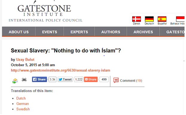 دأب مركز دراسات “جيت استون” على مهاجمة وانتقاد الإسلام ووصفه بالإرهاب والترويج للإسلاموفوبيا؛ وكان أحدث موضوعاته بتاريخ 4-10-2015 قد جاء بعنوان “الرق الجنسي حقيقة مؤكدة في الإسلام” إذ ادعى المركز اليميني أن تعاليم الإسلام تقول بأن غير المسلمين من ذوي البشرة البيضاء هم حقراء، ونساؤهم فاسقات، وهو ما يجعل المسلمين يكرهون غير المسلمين، واتهم المعهد المسلمين بنشر الإسلام بحد السيف.