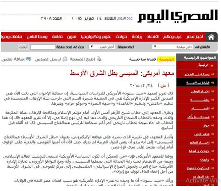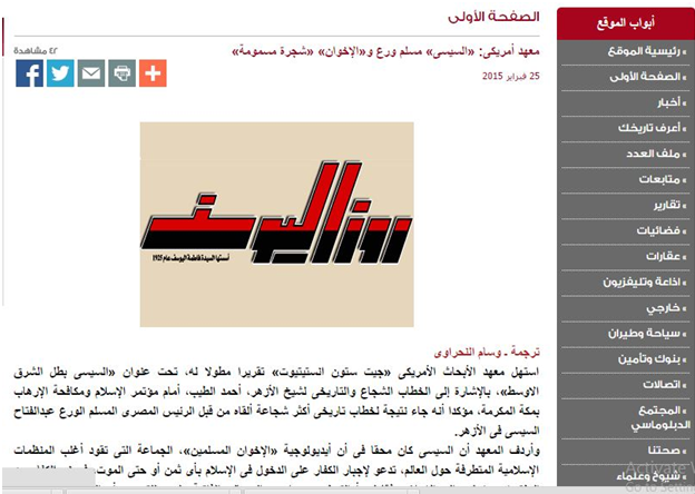 ويقابل تشويه المعهد اليميني للإسلام عبر الادعاءات الكاذبة، كيل المركز للثناء على السيسي وسياسته واعتباره المنقذ والمخلص، فيما يقوم الإعلام المصري بدوره بتسليط الضوء على إنتاج المركز ومقالاته، التي يصدرها لإيهام القارئ بأن الرأي العام العالمي وقادة الفكر في الغرب مؤيدون للسيسي، وبمجرد البحث داخل الموقع بكلمة “سيسي” تجد ما يقرب من 400 موضوع جميعها تأييد له ولسياساته، فبتاريخ 14-2-2015 نشر المركز مقالًا بعنوان “عبدالفتاح السيسي بطل الشرق الأوسط” وهو ما احتفت به الصحف المؤيدة لنظام الثالث من يوليو، لدرجة أن بعضها وضع الخبر في صدر صفحتها الأولى، مثل “اليوم السابع”، و”المصري اليوم”، و”روزاليوسف”، و”الوطن”.
