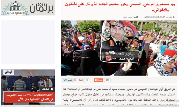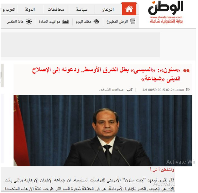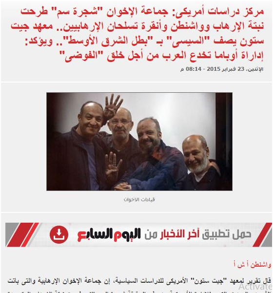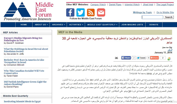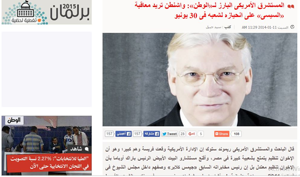 ولم تكتف صحيفة “الوطن” بنشر ما قاله المستشرق ريموند ستوك، أحد أبرز الباحثين في المركز اليميني “جيت ستون انستتيوت”، بل أجرت حوارًا معه نشره المركز باللغة العربية على موقعه بشبكة الإنترنت.