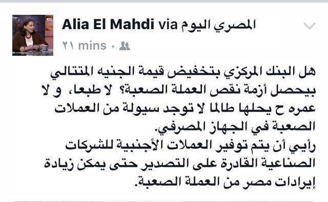 ومن جانبها تساءلت القيادية السابقة بالحزب الوطني علياء المهدي: هل البنك المركزي بتخفيضه قيمة الجنيه المتتالي يتصور أنه يقوم بحل أزمة نقص العملة الصعبة؟