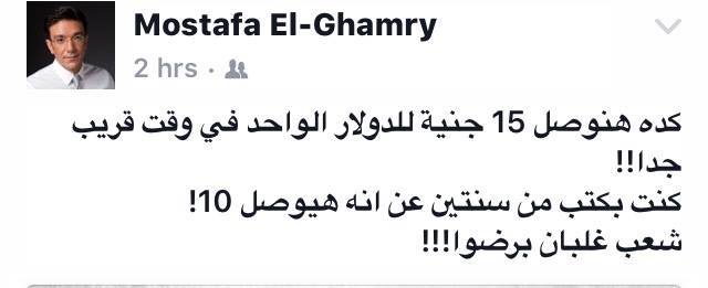 وأضاف الكاتب الصحفي مصطفى الغمري، المتخصص في الاقتصاد، أن بهذه السياسية التي يتبعها النظام سنصل إلى 15 جنيهًا للدولار الواحد في وقت قريب جدًّا، مشيرًا إلى أنه توقع ذلك منذ عامين أنه سيصل إلى 10 جنيهات.