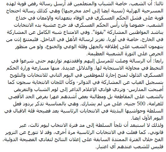 الرابع، أن الرسالة وصلت للمرسل إليهم وأفقدتهم توازنهم حتى شرعوا في التخبط في محاولة الاستجابة لها، والدلائل عديدة، منها مسارعة وزارة الحكم العسكري الذلول لمنح إجازة للموظفين في اليوم الثاني للانتخابات والتلويح بتسجيل الغياب عن المشاركة في الدوائر، وتردي قوادي الإعلام الداعر إلى لوم الشباب والتعريض بالشعب على المقاطعة بل مطالبة بعض أشدهم عهرًا بفرض الحد الأقصى للغرامة، 500 جنيه، على من لم يشارك”.
