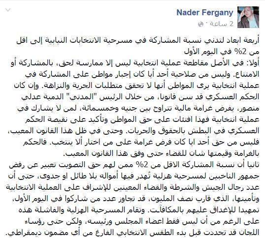 وقال -في منشور له على “فيس بوك”-: أولًا، الشعب، خاصة الشباب والمتعلمين، قد أرسل رسالة رفض قوية لهذه “المسرحية الهزلية”؛ احتجاجًا على فشل الحكم العسكري في الوفاء بتعهداته والإمعان في خداع الشعب، خصوصًا وأن رأس الحكم العسكري قد خرج عشية بدء الانتخابات يناشد المواطنين المشاركة “بقوة”.