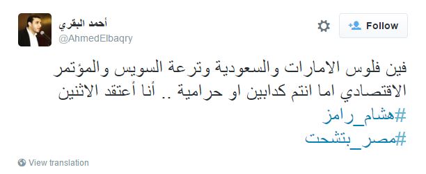 دشن عدد من رواد مواقع التواصل الاجتماعي هاشتاجا باسم “هشام رامز”، بعد استقالته من منصب محافظ البنك المركزي، وتعيين طارق عامر رئيس البنك الأهلي السابق، في منصبه بقرار من عبد الفتاح السيسي.